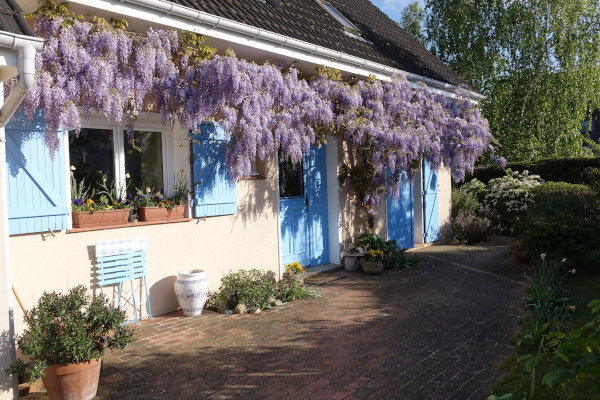 Après un printemps fleuri de narcisses, la glycine vous offrira un spectable sans pareil avant de laisser la place aux rosiers qui enivreront le jardin de leurs parfums. Le dernier à fleurir sera Fifi sur la volière, sa floraison unique est largement compensée par la beauté de ses roses et par son parfum.