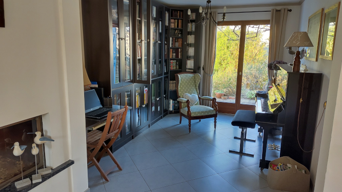 Le coin bibliothèque offre un petit bureau de travail et procure l'espace nécessaire à qui veut lire tranquillement. Les musiciens, eux, trouveront là un endroit idéal pour installer par exemple un piano.