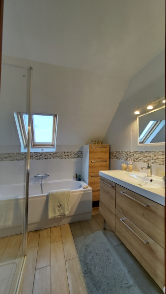 Deux lieux de toilette, tous deux équipés de radiateurs sèche-serviettes, sont à votre disposition. Il y a même une baignoire pour ceux qui restent attachés à ce genre de moment de délassement.