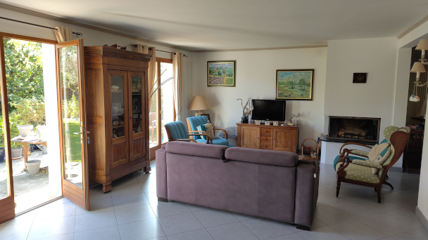 Le coin salon permet lui de passer d'excellents moments autour de la table basse et auprès de sa grande cheminée.